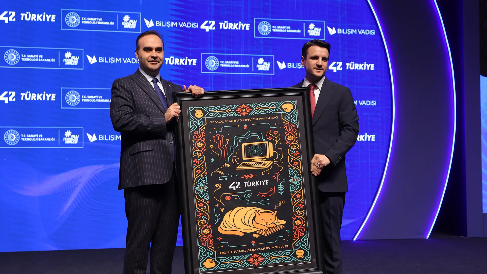 Program kapsamında 42 Türkiye öğrencileri tarafından tasarlanan özel hediye, Bilişim Vadisi Genel Müdürü Erkam Tüzgen tarafından Sanayi ve Teknoloji Bakanı Mehmet Fatih Kacır’a takdim edildi.
