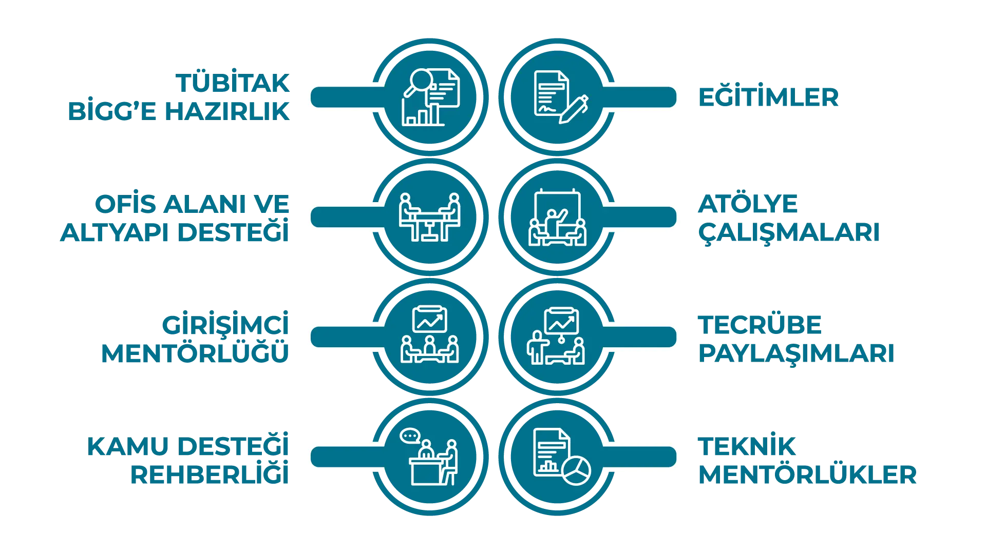 Bu çok yönlü yapı sayesinde girişimler; fikir doğrulamadan şirketleşmeye, hibe başvurusundan ölçeklenmeye kadar uzanan yolculukta gerekli tüm donanıma sahip olur.